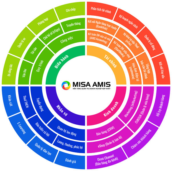 MISA AMIS là nền tảng quản trị doanh nghiệp toàn diện đã và đang hỗ trợ 250.000 doanh nghiệp Việt Nam chuyển đổi số với 4 phân hệ: tài chính – kế toán, marketing – bán hàng, quản trị nhân sự và văn phòng số, đáp ứng mọi quy mô và ngành nghề. Với chi phí thấp - dễ triển khai - nhanh có kết quả, MISA AMIS đặc biệt phù hợp cho doanh nghiệp vừa và nhỏ giúp tiết kiệm chi phí và tối ưu hóa hiệu quả quản lý.