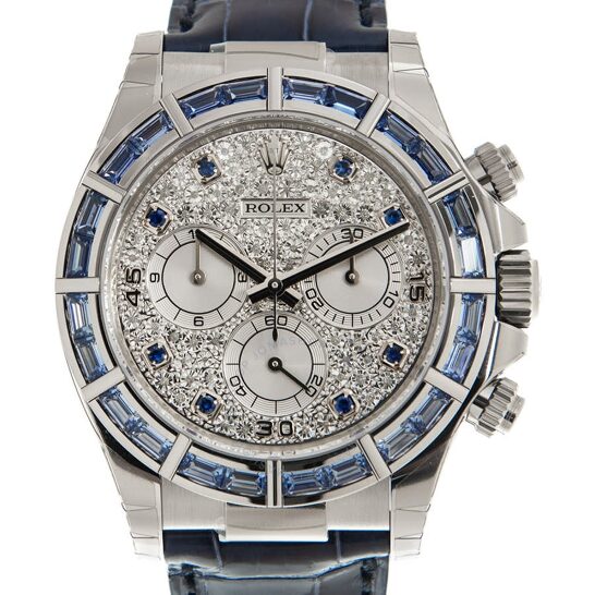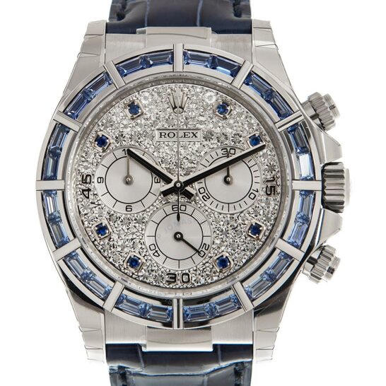 Nếu vẻ hào nhoáng của kim cương không phải là sở thích của bạn, hãy chọn một chiếc đồng hồ thanh lịch như Cosmograph Daytona. Vỏ bạch kim màu trắng kết hợp với màu xanh lam, cùng gờ bằng gốm đen tạo độ tương phản hoàn hảo. Giống như các thiết kế khác của Cosmograph Daytona, đồng hồ có khả năng chống thấm nước và chống xước. Kiểu dáng thể thao khiến đây là sự lựa chọn sáng giá cho các quý ông khi đi du lịch hoặc chơi thể thao.