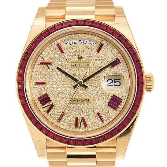 Màu đỏ và vàng chủ đạo của Rolex Day-Date 40 mang lại nét sang trọng, quý phái, và quyền lực. Thiết kế danh tiếng này được ra mắt lần đầu vào năm 1956. Dây đeo President được làm từ vàng 18kt và mặt số được lát kim cương cùng kim đồng hồ màu vàng. Vòng bezel được nạm ngọc bích màu đỏ, cũng như các giờ bằng số La Mã. Ngoài ra, nó còn có khả năng chống thấm nước ở độ sâu hơn 100m.