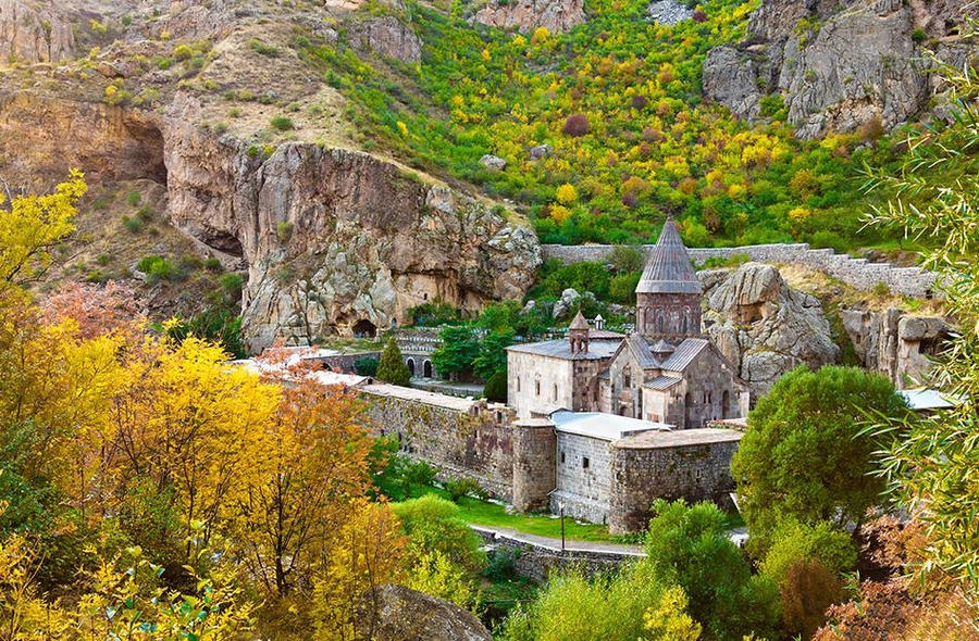 Khởi phát là nhà nguyện nhỏ nằm trong một hang động, nơi Gregory tuyên bố đã tổ chức Mùa xuân linh thiêng vào thế kỷ thứ 4. Nhờ vị trí đắc địa cạnh hẻm núi sông Azat đầy vách đá, tu viện đã trở thành trung tâm giáo hội và văn hóa của Armenia thời Trung cổ. Cái tên “Greghard” (có nghĩa là "ngọn giáo" trong tiếng Armenia) xuất phát từ ngọn giáo nổi tiếng đã làm Chúa Kitô bị thương trên Thập giá.