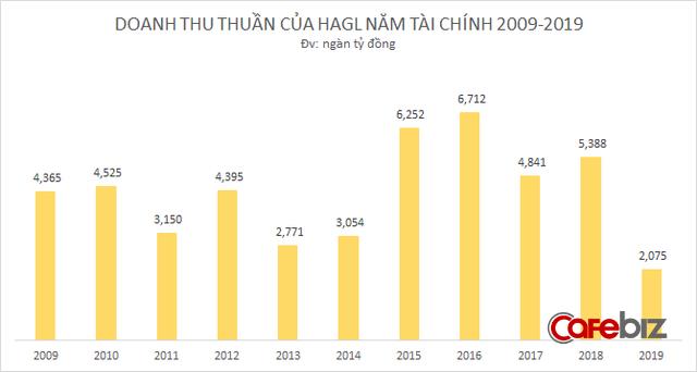 Doanh thu thuần của HAGL giai đoạn 2009-2019 biến động lên xuống liên tục theo từng ngành hàng chủ lực. Trong năm tài chính gần nhất 2019, chỉ tiêu này chỉ đạt hơn 2000 tỷ đồng, mức thấp nhất trong thập kỷ này.