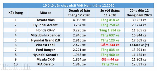 Trong đó, Toyota Vios tiếp tục phá kỷ lục để khép lại hành trình bảo vệ ngôi vương “ô tô bán chạy nhất thị trường năm 2020”. Hyundai Accent về thứ hai, trong khi Honda CR-V có cú nước rút ngoạn mục trong tháng cuối cùng của năm 2020 để góp mặt trong Top 3. Các mẫu mã khác góp mặt trong danh sách 10 ô tô bán chạy nhất Việt Nam tháng 12/2020 đều đạt doanh số bán trên 1.800 xe.