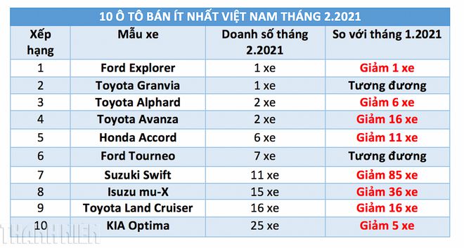 Sức mua giảm trong tháng trùng với dịp nghỉ Tết Nguyên Đán 2021 khiến Ford Explorer, Toyota Granvia chật vật tìm khách, trong khi doanh số Toyota Alphard, Toyota Avanza... chỉ đạt vỏn vẹn 2 xe.