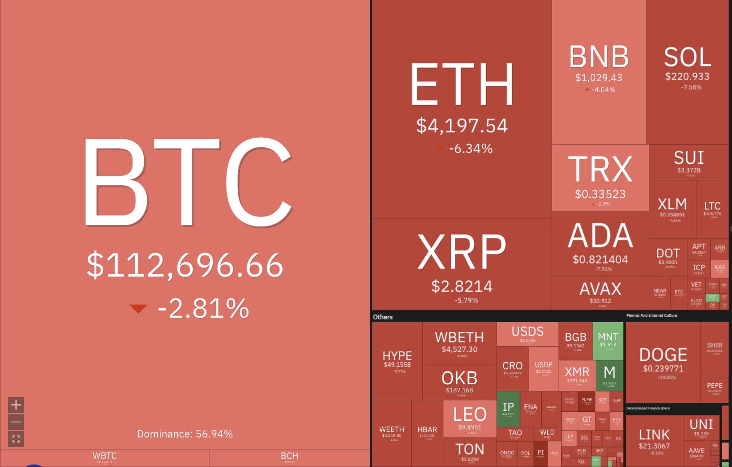 Đáng chú ý, theo dữ liệu từ CoinDesk, sự sụt giảm của thị trường đã kích hoạt một đợt thanh lý hàng loạt. Hơn 1,5 tỷ USD giá trị các vị thế mua sử dụng đòn bẩy cao trên toàn thị trường tiền mã hóa đã bị buộc phải đóng lại. Sự kiện này không chỉ gây thiệt hại lớn cho các nhà giao dịch mà còn tạo ra một vòng xoáy bán tháo, khi các lệnh thanh lý tự động làm gia tăng nguồn cung đột ngột và đẩy giá xuống sâu hơn. Hiện tại, thị trường altcoin cũng ghi nhận mức sụt giảm mạnh theo diễn biến của Bitcoin.
