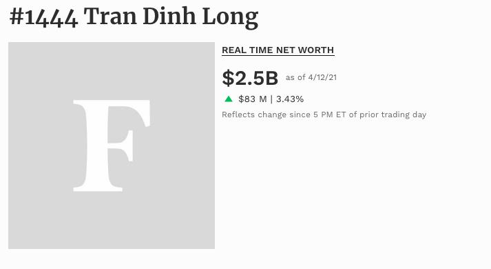 Mức tăng trưởng mạnh của HPG giúp ông Long giữ vững phong độ trong danh sách tỷ phú thế giới với thứ hạng 1.744.