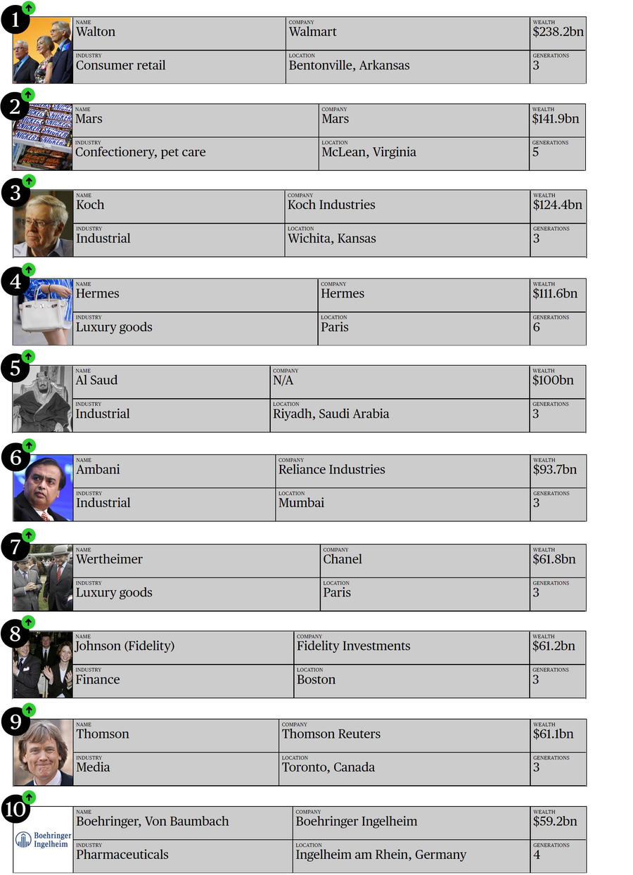 Walton bỏ xa gia tộc đứng thứ 2 trong danh sách - nhà Mars. Gia đình Mars hiện đã truyền tới đời thứ 6 là chủ sở hữu các tập đoàn bánh kẹo nổi tiếng thế giới như M&Ms, Milky Way,... với tổng tài sản lên tới 141,9 tỷ USD.