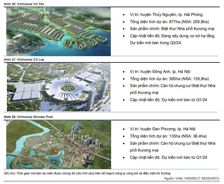 VNDirect dự phóng doanh số ký bán mới của Vinhomes trong năm 2024 sẽ tăng 29,4% so với cùng kỳ, đạt 91.600 tỷ đồng, được đóng góp chủ yếu bởi ba đại dự án Vinhomes Vũ Yên (877 ha, Hải Phòng), Vinhomes Cổ Loa (385 ha, Hà Nội), Vinhomes Wonder Park (133 ha, Hà Nội).