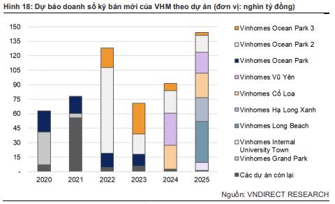 VNDirect dự báo, với năng lực triển khai dự án theo đúng tiến độ của VHM, doanh số bán mới sẽ quay lại quỹ đạo tăng trưởng ở mức gần 91.600 tỷ đồng trong năm 2024, tăng khoảng 29,4% so với cùng kỳ. Doanh số bán mới được đóng góp chủ yếu bởi ba đại dự án dự kiến được mở bán là Vinhomes Vũ Yên (877 ha, Hải Phòng), Vinhomes Cổ Loa (385 ha, Hà Nội), Vinhomes Wonder Park (133 ha, Hà Nội). Bên cạnh đó còn có đóng góp từ các căn thấp tầng còn lại tại hai dự án là Vinhomes Ocean Park 2 và 3.