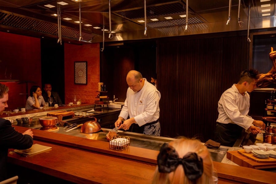 Nhà hàng với 14 chỗ ngồi cao cấp được xem đầu bếp Hiroshi Yamaguchi nấu các món teppanyaki với hương vị phức tạp một cách khéo léo.