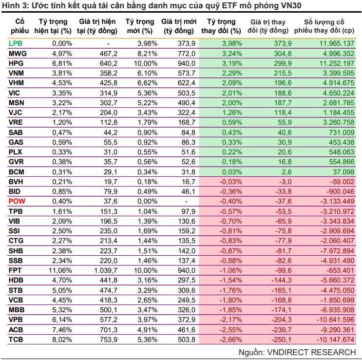 Nhóm phân tích VNDirect ước tính trong kỳ tái cân bằng danh mục lần này các cổ phiếu sẽ được các quỹ ETF mô phỏng chỉ số VN30 mua nhiều nhất bao gồm LPB, MWG và HPG với khối lượng tương ứng là 11,9 triệu cổ phiếu (374 tỷ đồng), 4,99 triệu cổ phiếu (304,8 tỷ đồng) và 11,2 triệu cổ phiếu (300 tỷ đồng). Trong khi TCB, ACB và VPB có thể là các cổ phiếu được các quỹ ETF này bán ra nhiều nhất với khối lượng tương ứng là 10,1 triệu cổ phiếu (250 tỷ đồng), 9,2 triệu cổ phiếu (240 tỷ đồng) và 10,6 triệu cổ phiếu (204 tỷ đồng).