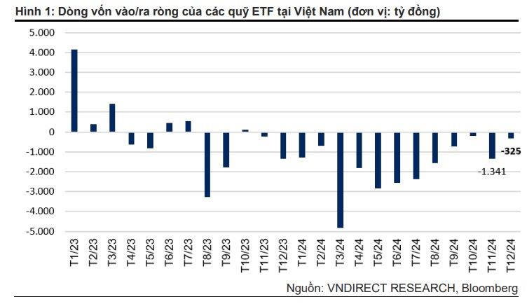 Về giao dịch ETF, Chứng khoán VNDirect ước tính các ETF Việt Nam tiếp tục ghi nhận dòng vốn rút ròng trong tháng 12/2024, với giá trị rút ròng là hơn 325 tỷ đồng, ít hơn so với giá trị rút ròng 1.341 tỷ đồng trong tháng trước đó.