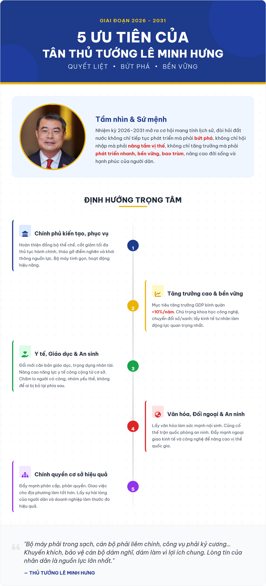Thủ tướng Lê Minh Hưng khẳng định: "Tôi xin hứa sẽ cùng tập thể Chính phủ, các bộ ngành, địa phương đoàn kết một lòng, quyết tâm đưa đất nước bước vào giai đoạn phát triển bứt phá, giàu mạnh, phồn vinh, văn minh, hạnh phúc".