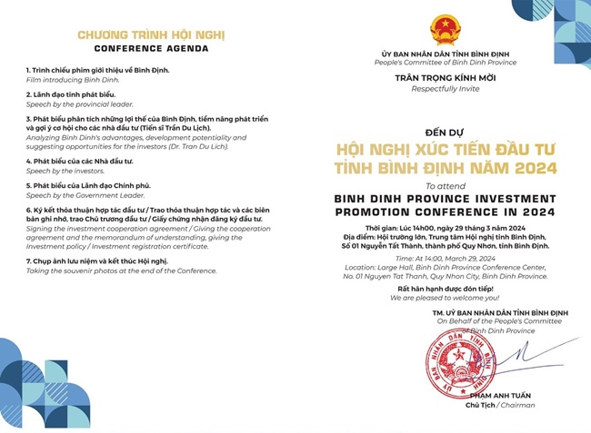 Hội nghị Xúc tiến Đầu tư tỉnh Bình Định năm 2024 sẽ diễn ra vào ngày 29/3/2024 tại hội trường lớn, Trung tâm Hội nghị tỉnh Bình Định, số 1 Nguyễn Tất Thành, TP Quy Nhơn.