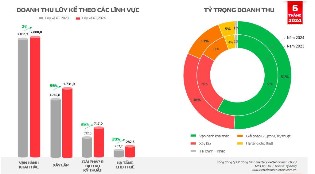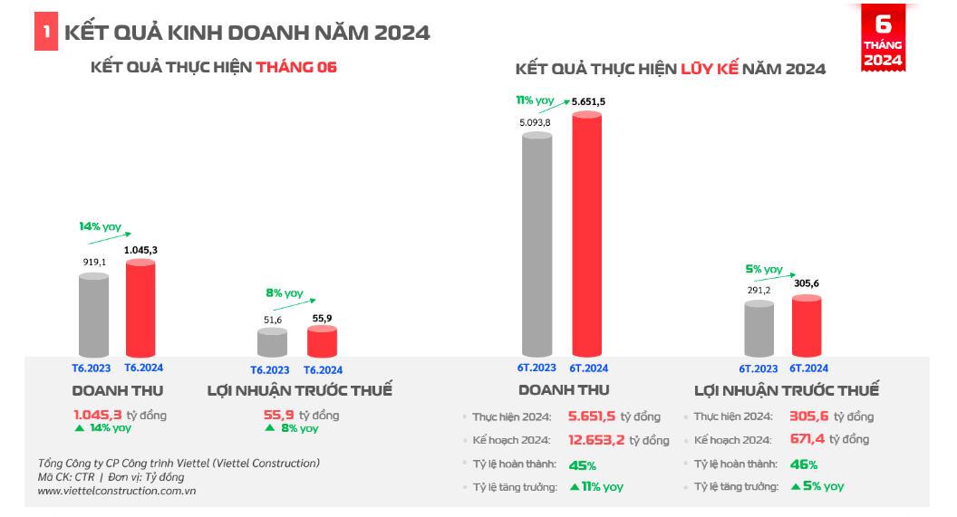 Luỹ kế 6 tháng đầu năm doanh thu của Viettel Construction đạt 5.651,5 tỷ đồng, tăng trưởng 11% so với cùng kỳ 2023 và thực hiện được 45% kế hoạch doanh thu năm.