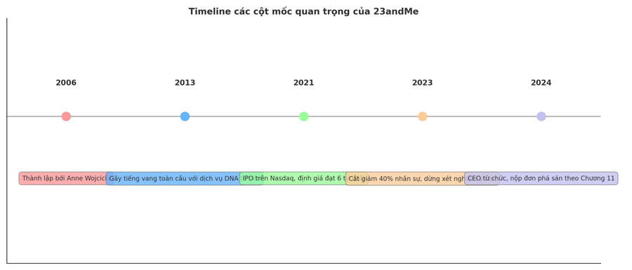 23andMe được thành lập năm 2006 bởi Anne Wojcicki, Linda Avey và Paul Cusenza với mục tiêu thương mại hoá dịch vụ xét nghiệm gen tại gia – nơi người dùng có thể kiểm tra ADN để xác định nguồn gốc tổ tiên hoặc nguy cơ di truyền các bệnh lý nhất định. Startup này từng được xem là một cú hích lớn trong lĩnh vực “consumer genomics” (di truyền học tiêu dùng), thu hút hàng trăm triệu USD từ các nhà đầu tư lớn, bao gồm cả Google (thông qua GV – quỹ đầu tư mạo hiểm của Alphabet). 23andMe cũng từng có kế hoạch trở thành nền tảng dữ liệu y học cá nhân cho các hãng dược, nhắm tới nguồn doanh thu dài hạn từ nghiên cứu và hợp tác phát triển thuốc.