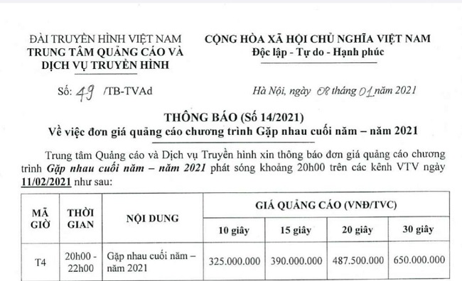 Cụ thể, vào ngày 11/01/2021, đúng một tháng trước ngày trình chiếu chương trình, Trung tâm Quảng cáo và Dịch vụ truyền hình – Đài Truyền hình Việt Nam (TVAd) đã phát đi thông báo số 14/2021. Trong đó, đơn giá quảng cáo trong chương trình Gặp nhau cuối năm 2021 phát sóng trên các kênh của VTV có mức như sau: 650 triệu đồng cho 30 giây phát sóng, giá quảng cáo giảm dần 487 triệu, 390 triệu, 325 triệu cho lần lượt 20 giây, 15 giây, 10 giây quảng cáo.