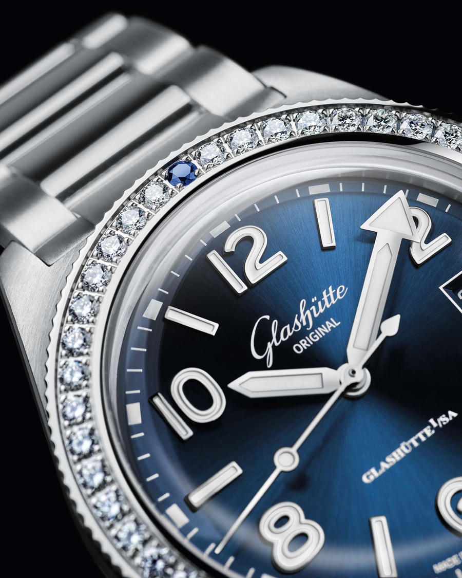 Phần vỏ được nạm kim cương trắng, với một viên sapphire ở vị trí 12 giờ. Giá bán của Glashütte Original SeaQ hiện tại là 24.550 AUD (420 triệu đồng).