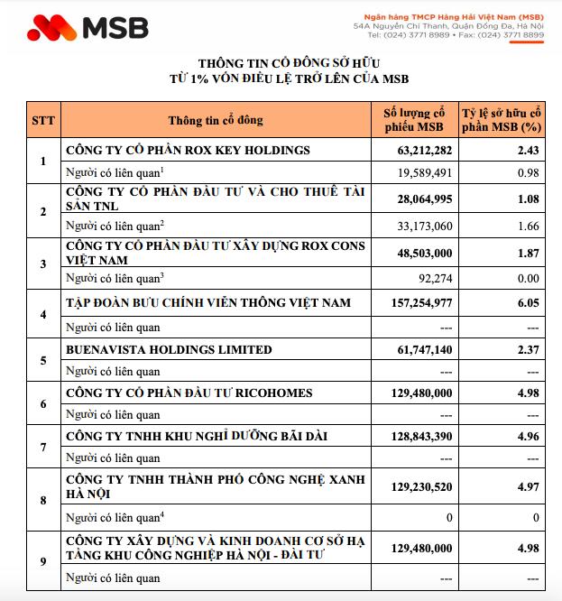 Bên cạnh đó, còn có 2 tổ chức khác là Công ty Xây dựng và Kinh doanh Cơ sở Hạ tầng Khu công nghiệp Hà Nội - Đài Tư sở hữu 129,4 triệu cổ phiếu, tương đương tỷ lệ sở hữu 4,98% vốn điều lệ MSB; Công ty cổ phần Đầu tư Ricohomes sở hữu 129,48 triệu cổ phiếu, tương đương 4,98% vốn ngân hàng.