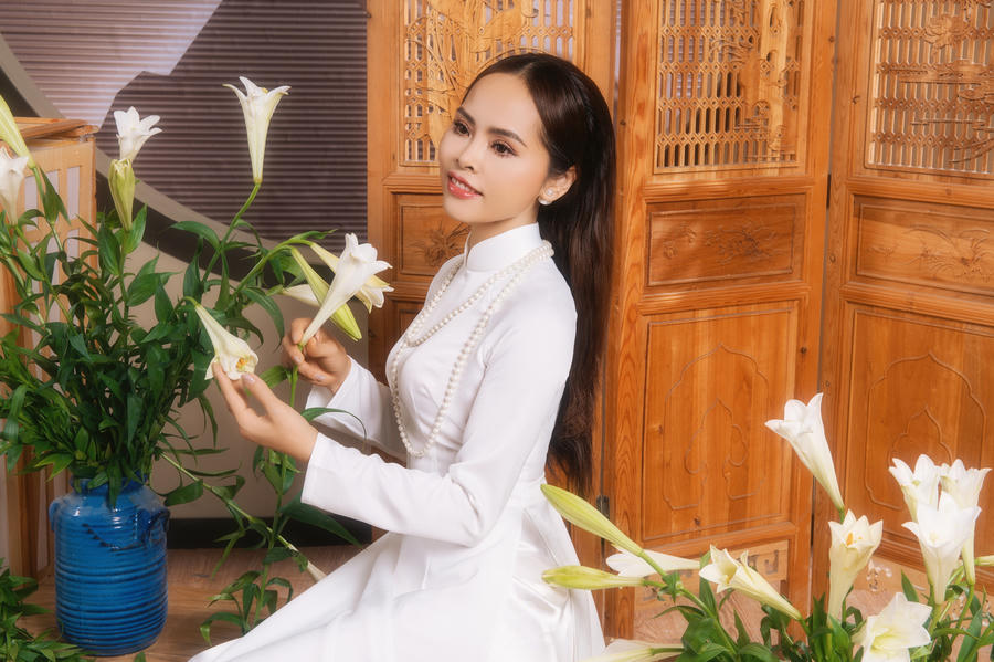 Vào mùa hày, hoa loa kèn nở rộ, có mặt trên khắp các con phố. Phạm Thị Cúc yêu thích loài hoa này bởi vẻ đẹp nhẹ nhàng với màu trắng tinh khôi của chúng. Chính vì vậy, trong sắc hương của “loài hoa gọi tháng Tư”, hình ảnh người phụ nữ với áo dài càng trở nên quyến rũ hơn.