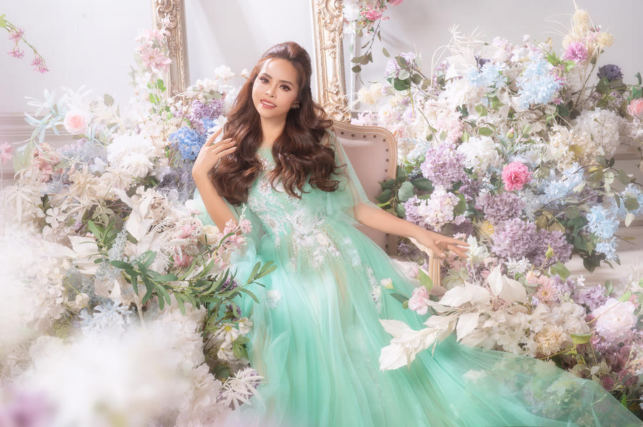 Trong cái nắng rực rỡ của mùa hè, người phụ nữ “không tuổi” Phạm Thị Cúc đã tỏa sáng trong vẻ đẹp tinh khôi trở về nguồn cội của con gái Việt. Cùng với áo dài, Phạm Cúc khéo léo chọn cho mình một kiểu tóc giản dị buông dài với ngôi giữa, tôn lên khuôn mặt trẻ trung và trong sáng. Trong không gian cổ điển, vẻ đẹp ấy như hòa tan, để cùng người đẹp kể một câu chuyện xưa đẹp đẽ.