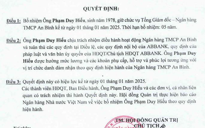 Hội đồng quản trị Ngân hàng TMCP An Bình (ABBank, mã ck: ABB) vừa ra quyết định bổ nhiệm ông Phạm Duy Hiếu giữ chức vụ Tổng Giám đốc ABBank kể từ ngày 01/01/2025. Thời hạn bổ nhiệm là 5 năm.