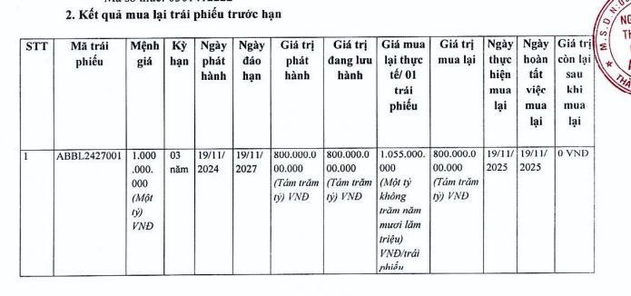 Cụ thể, vào ngày 19/11/2025, ABBank đã thực hiện mua lại trước hạn toàn bộ lô trái phiếu mã ABBL2427001 với giá trị mua lại thực tế 1,055 tỷ đồng/trái phiếu, tổng giá trị mua lại tính theo mệnh giá 800 tỷ đồng.