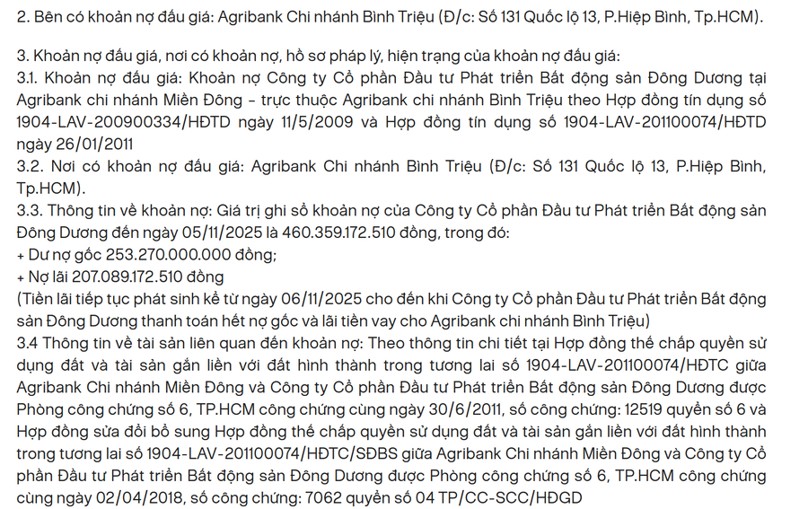 Theo thông báo từ Ngân hàng Nông nghiệp và Phát triển Nông thôn (Agribank) chi nhánh Bình Triệu, khoản nợ của Công ty Cổ phần Đầu tư Phát triển Bất động sản Đông Dương (Bất động sản Đông Dương) phát sinh từ hai hợp đồng tín dụng được ký kết vào năm 2009 và năm 2011.