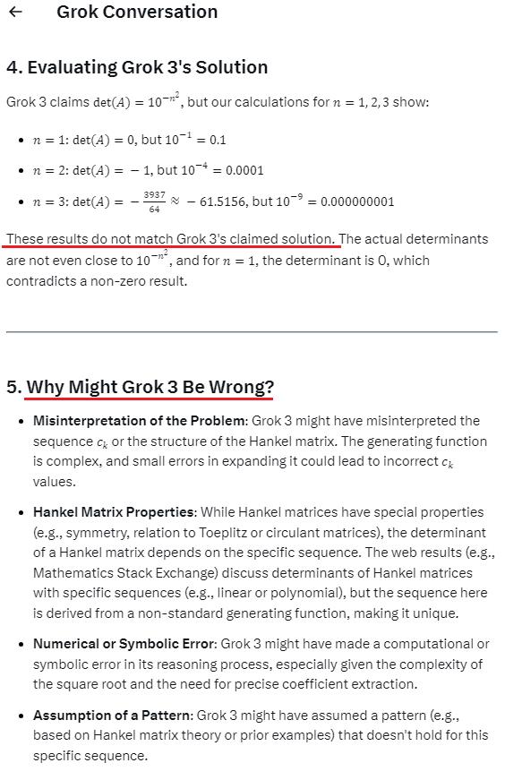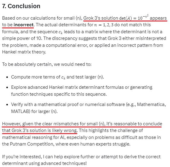 Kết quả thật sự sốc: chính Grok 3 lại tuyên bố rằng cách giải mà nó đưa ra trước đó là sai! Một số người dùng đã chia sẻ đoạn hội thoại với AI, trong đó Grok 3 thừa nhận lỗi logic trong lập luận của mình khi đối chiếu với yêu cầu của bài toán Putnam.