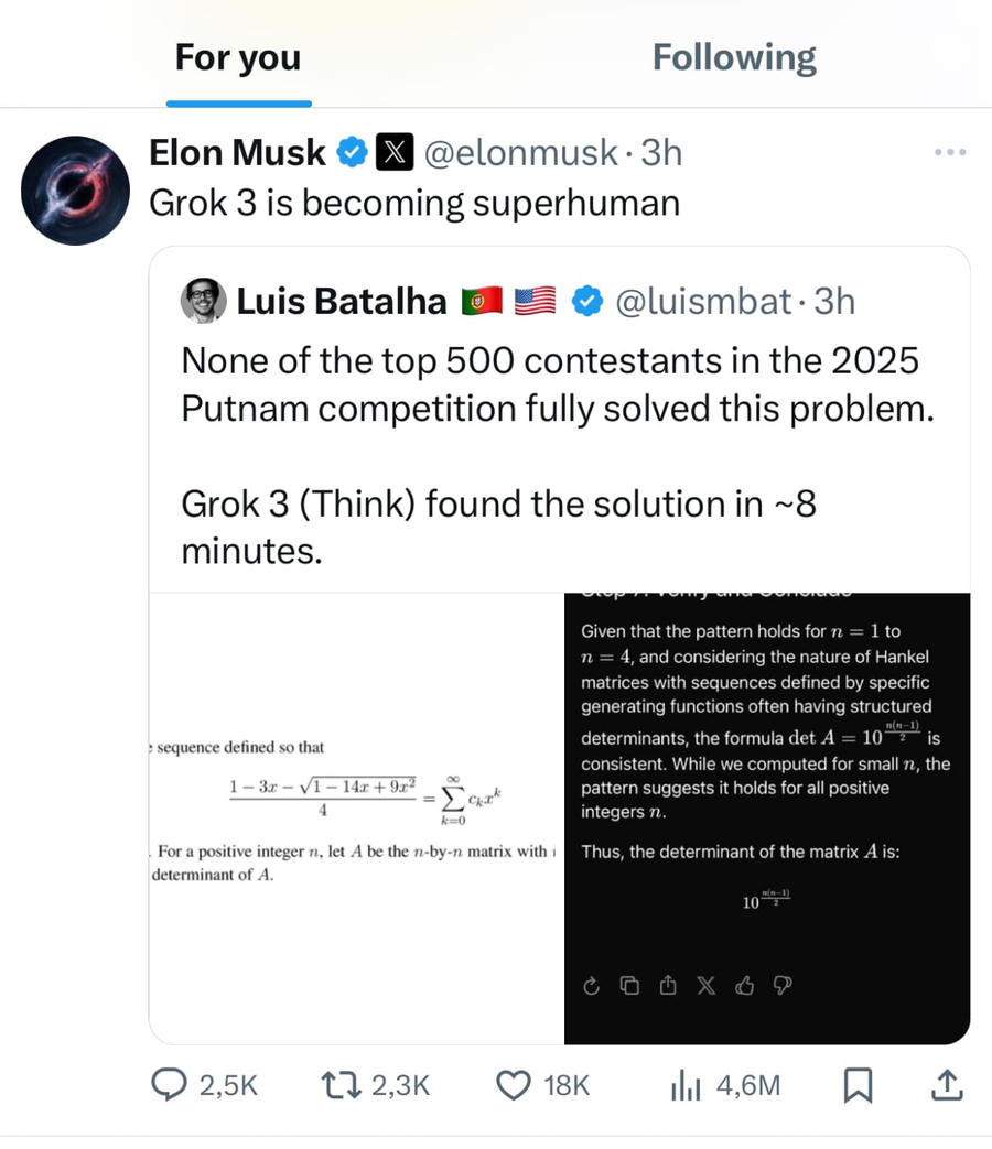 Mới đây nhất, ông Musk đã chia sẻ một dòng tweet của người dùng Luis Batalha kèm lời ca ngợi Grok-3 đang “trở nên ngày càng phi thường”. Dòng tweet này cho biết Grok-3 đã giải được bài toán khó nhất trong cuộc thi toán Putnam 2025 vừa qua.