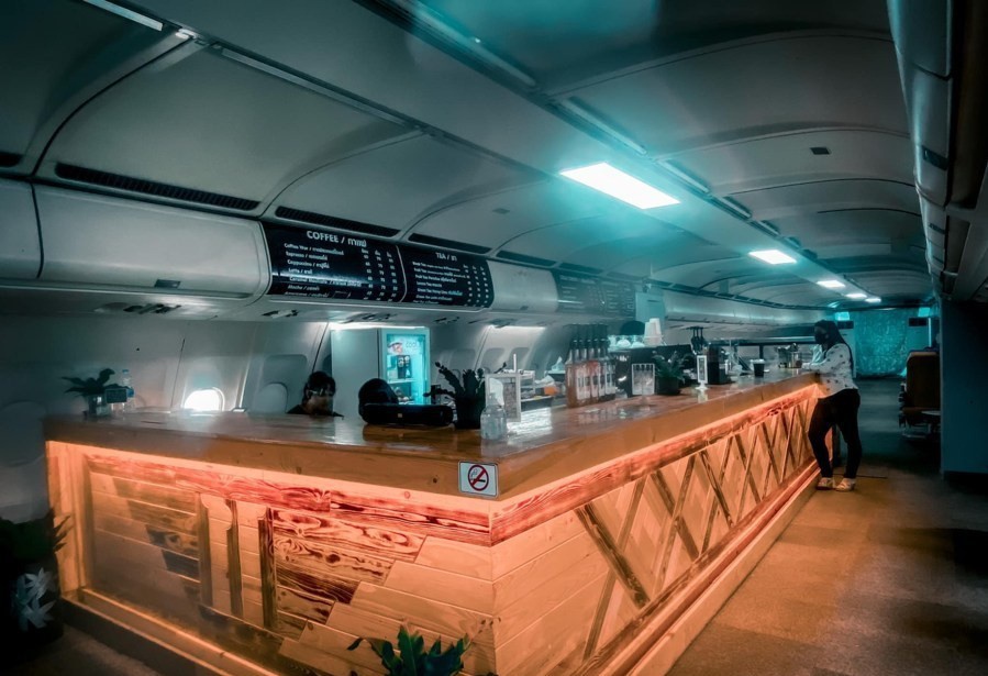 Nội thất của chiếc máy bay được sắp xếp lại để phù hợp hơn với mục đích sử dụng mới, tuy nhiên, vẫn sử dụng ghế hạng phổ thông và hạng thương gia của máy bay. Khách tới quán thậm chí còn có thể ngồi thưởng thức cà phê ngay trên ghế lái của cơ trưởng và cơ phó.