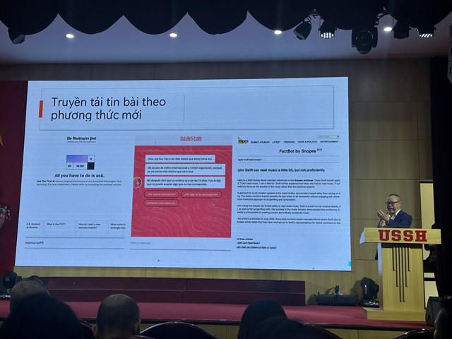 GS.TS Nguyễn Đức An từ Đại học Bournemouth đã trình bày những ứng dụng thực tế của AI trong các tòa soạn quốc tế: từ việc Hãng tin AP sử dụng AI để viết hàng ngàn bản tin tài chính mỗi quý, The Guardian dùng AI để trực quan hóa dữ liệu, cho đến khả năng tạo hình ảnh, video phức tạp chỉ trong vài phút bằng các công cụ như MidJourney hay Runway AI. Nhiều tòa soạn lớn như The Washington Post (với công cụ Heliograf tường thuật bầu cử, thể thao), BBC (dịch tự động, cá nhân hóa nội dung), hay các cơ quan báo chí điều tra như ProPublica, Texas Tribune (dùng AI phân tích video, âm thanh) cũng đang tích cực khai thác tiềm năng của công nghệ này.