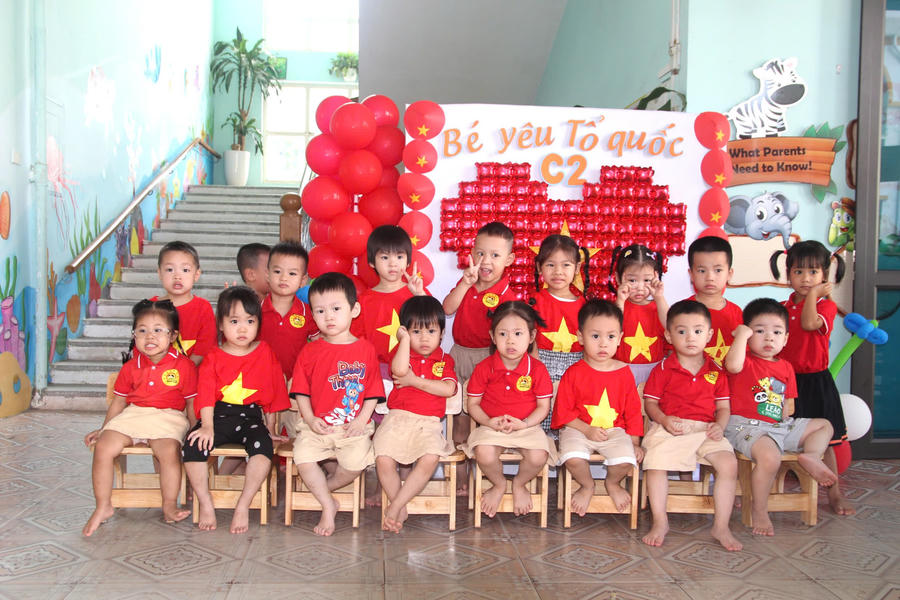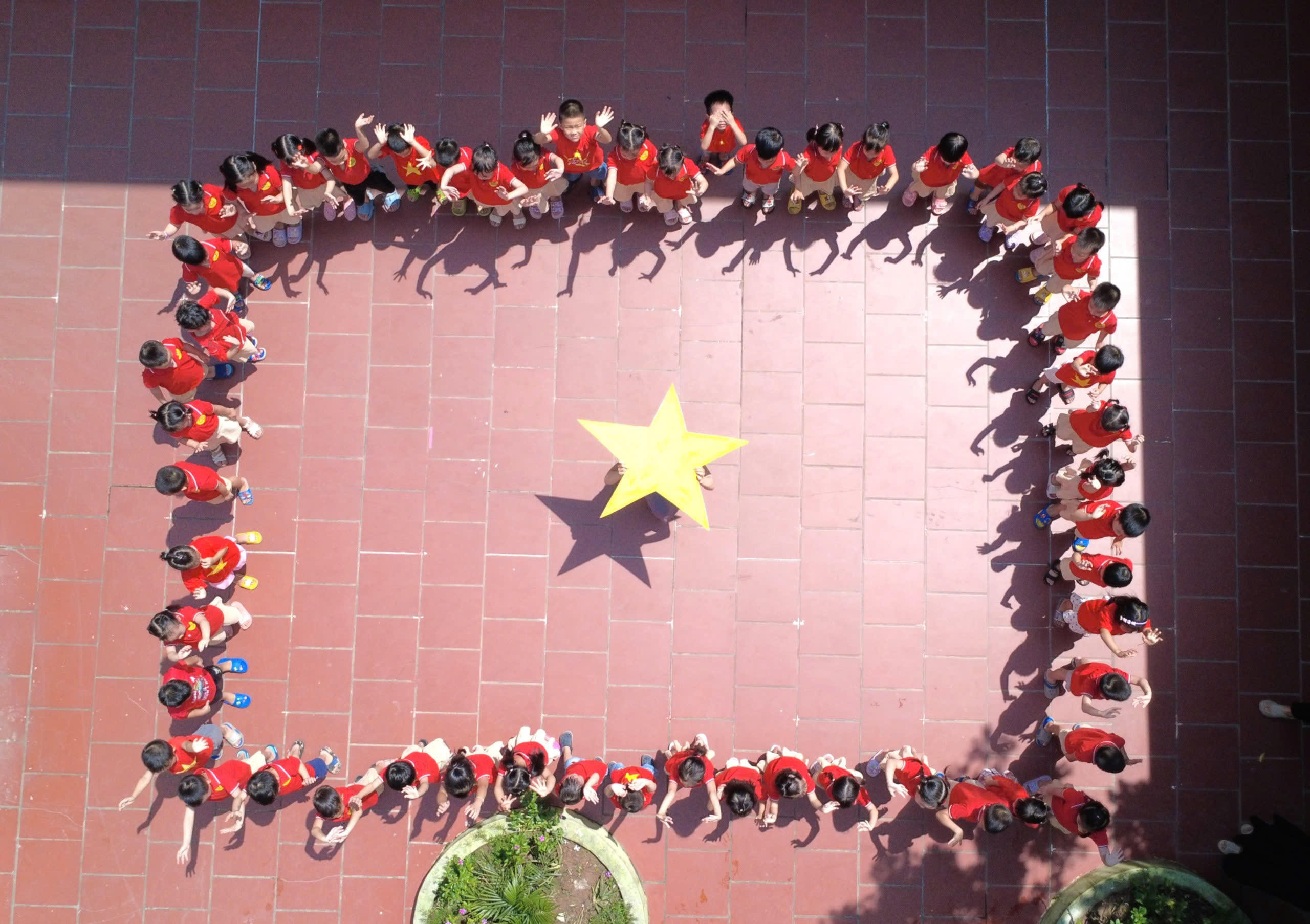 Trong sắc đỏ rực rỡ của những chiếc áo mang hình cờ Tổ quốc, hàng trăm em nhỏ đã cùng nhau xếp hình bản đồ Việt Nam, cờ đỏ sao vàng và con số “80, 2-9”, thể hiện tình yêu quê hương đất nước và niềm tự hào dân tộc ngay từ lứa tuổi mầm non.