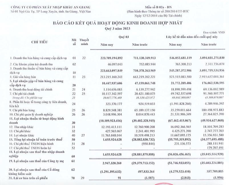 Lũy kế ba quý đầu năm, Angimex mang về 545,2 tỷ đồng doanh thu thuần, chưa bằng 1/5 doanh thu cùng kỳ năm 2022. Lãi sau thuế ghi nhận âm 56 tỷ đồng, lỗ đậm hơn mức 35 tỷ đồng cùng kỳ năm ngoái.