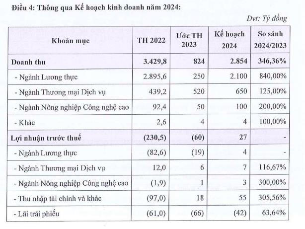 Đối với kế hoạch kinh doanh 2024, Đại hội đồng cổ đông AGM thông qua mục tiêu doanh thu đạt 2.854 tỷ đồng, gấp gần 3,5 lần ước thực hiện năm 2023, trong đó doanh thu ngành lương thực chiếm gần 74% tỷ trọng với 2.100 tỷ đồng. Lợi nhuận trước thuế dự kiến đạt 27 tỷ đồng.