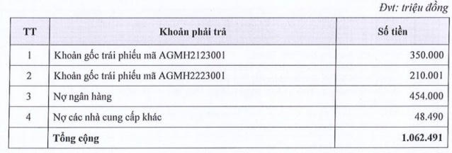 Doanh nghiệp cho biết do tình hình sản xuất kinh doanh và tình hình tài chính còn nhiều khó khăn, AGM chưa thể thu xếp được nguồn thanh toán cho kỳ tính lãi này. Các phương án liên quan đến lô trái phiếu sẽ được AGM trao đổi và thống nhất với nhà đầu tư tại Hội nghị Chủ sở hữu trái phiếu diễn ra vào ngày 23/06 tới đây.
