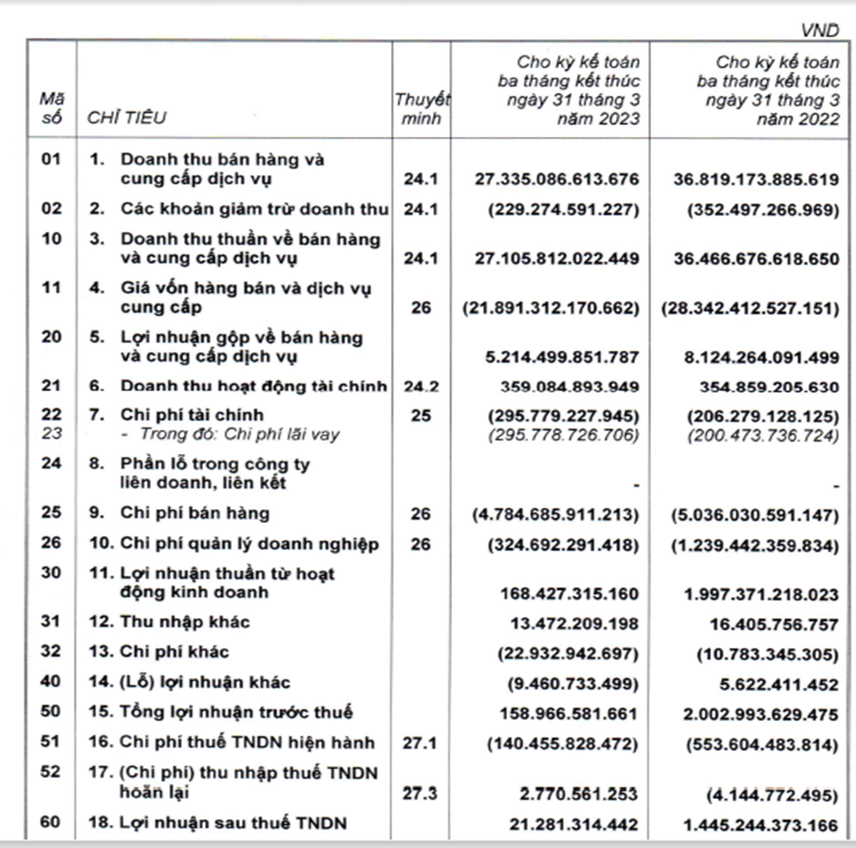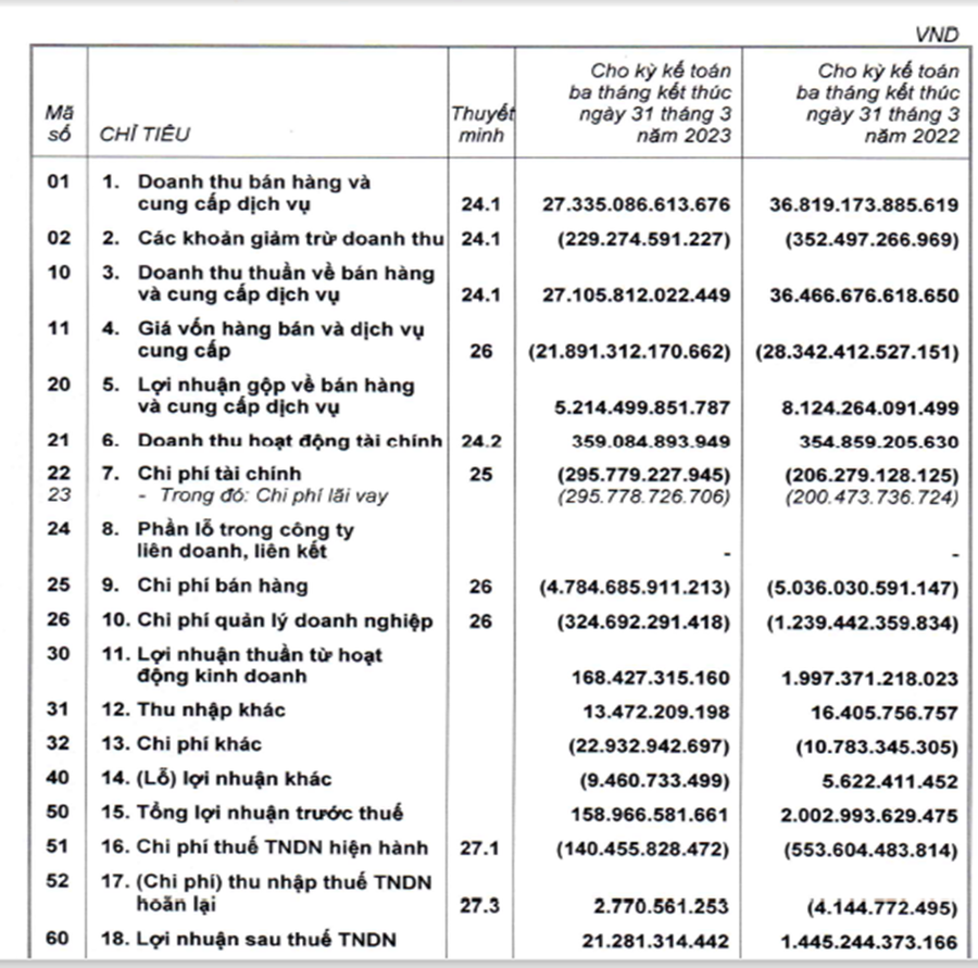 Biên lợi nhuận gộp giảm từ 22% trong quý I/2022 xuống 19% trong quý I/2023, trong khi chi phí hoạt động mặc dù đã giảm đáng kể nhưng mức giảm chi phí không tương ứng với sự sụt giảm doanh thu do một số chi phí cố định, dẫn đến tác động mạnh lên lợi nhuận ròng.