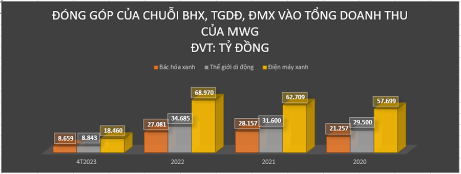 Luỹ kế 4 tháng 2023, tổng doanh thu của MWG đạt 36.847 tỷ đồng, giảm 23% so với cùng kỳ. So với kế hoạch doanh thu đạt 135.000 tỷ đồng năm 2023, công ty mới hoàn thành 27% chỉ tiêu cả năm.