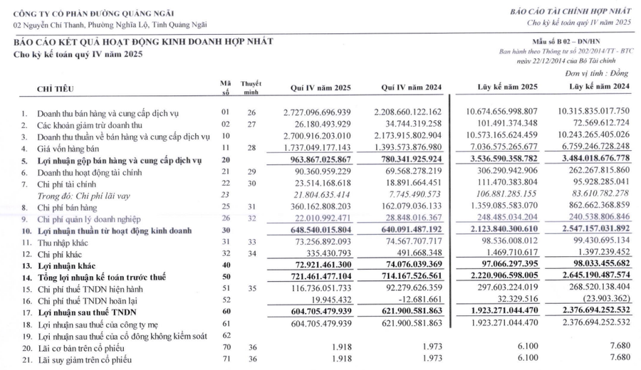 CTCP Đường Quảng Ngãi (mã ck: QNS) vừa công bố kết quả kinh doanh quý IV/2025 và cả năm 2025.