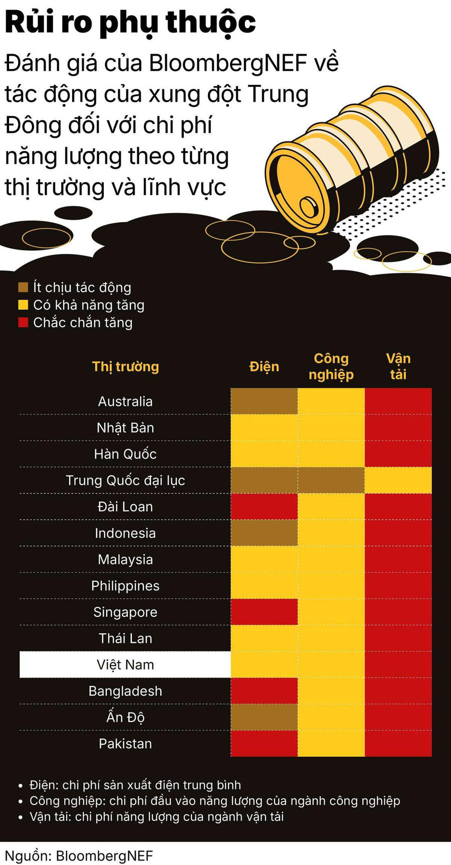 Theo dữ liệu phân tích từ BloombergNEF, sự leo thang căng thẳng tại Trung Đông chắc chắn làm gia tăng chi phí năng lượng của ngành vận tải Việt Nam, đồng thời đẩy chi phí sản xuất công nghiệp và điện năng lên các mức thiết lập mới. Báo cáo của Chứng khoán Vietcap chỉ ra mức độ nhạy cảm của cấu trúc năng lượng trong nước khi Việt Nam hiện nhập khẩu khoảng 2/3 lượng dầu thô, 1/3 sản phẩm dầu mỏ, 70% khí LPG và 15% tổng nhu cầu khí dưới dạng LNG. Cơ cấu này khiến những nhịp tăng giá từ thị trường dầu mỏ quốc tế nhanh chóng phản ánh vào giá thành sản xuất và vận hành nội địa.