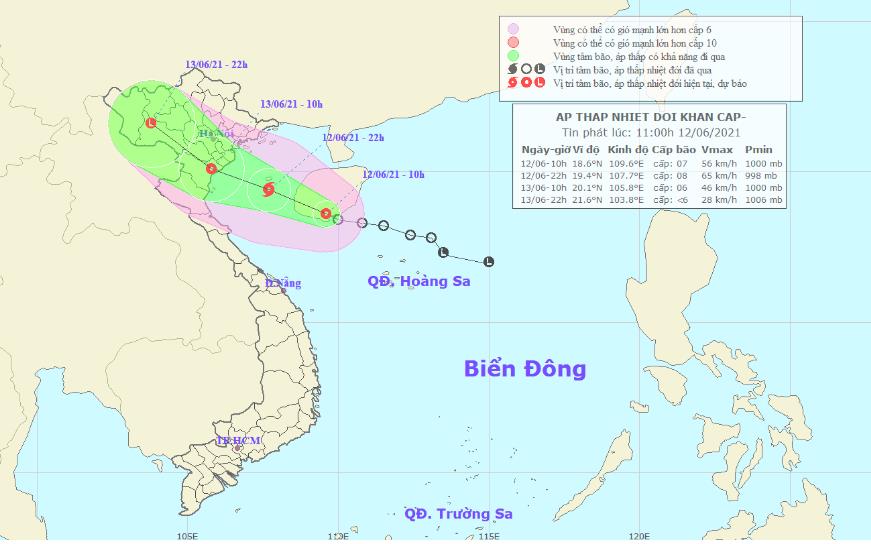 Vào hồi 10 giờ ngày 12/6, vị trí tâm áp thấp nhiệt đới ở vào khoảng 18,6 độ Vĩ Bắc; 109,6 độ Kinh Đông, trên khu vực phía Nam đảo Hải Nam (Trung Quốc). Sức gió mạnh nhất vùng gần tâm áp thấp nhiệt đới mạnh cấp 7 (50-60km/giờ), giật cấp 9. Bán kính gió mạnh từ cấp 6, giật từ cấp 8 trở lên khoảng 90km tính từ tâm áp thấp nhiệt đới.