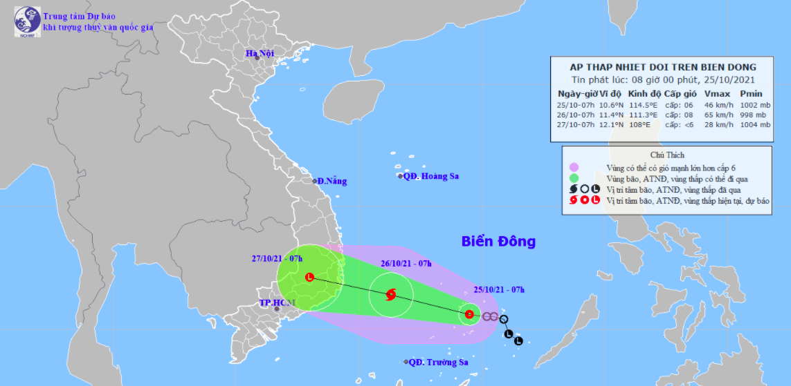 Dự báo, áp thấp nhiệt đới này hướng vào đất liền khu vực Nam Trung Bộ trong ngày 26/10. Hình thái này có thể gây ra đợt mưa lớn tiếp theo cho các tỉnh Trung Bộ.