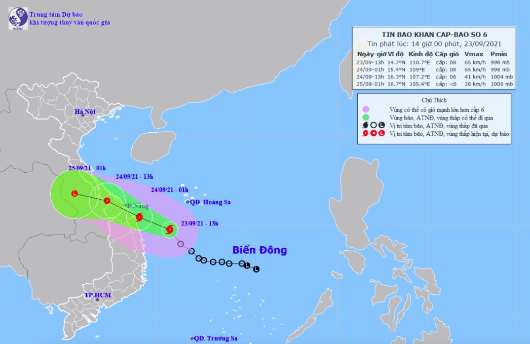 Chiều 23/9, áp thấp nhiệt đới đã mạnh lên thành bão, cơn bão số 6 năm 2021. Lúc 15 giờ, vị trí tâm bão số 6 cách bờ biển Bình Định khoảng 190km, cách bờ biển Quảng Ngãi khoảng 165km, cách bờ biển Quảng Nam khoảng 208km. Sức gió mạnh nhất cấp 8, giật cấp 10.