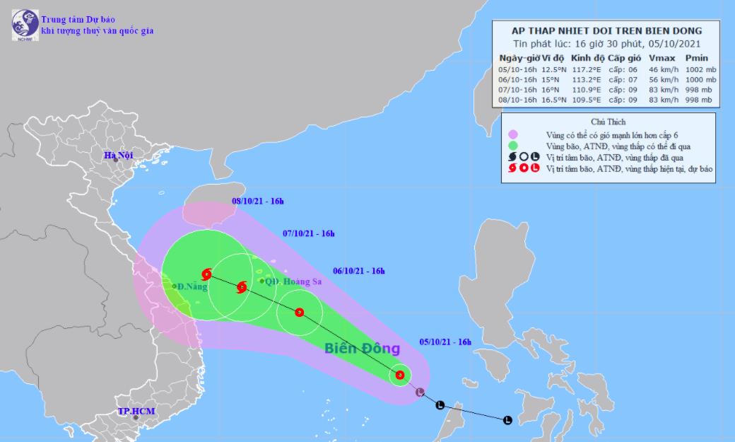 Trong 12 giờ tới, vùng áp thấp di chuyển theo hướng tây bắc, vận tốc 20-25 km/h và mạnh thêm. Dự báo chiều 6/10, tâm áp thấp nhiệt đới cách quần đảo Hoàng Sa khoảng 330 km về phía đông nam. Sức gió mạnh nhất cấp 7, giật cấp 9.