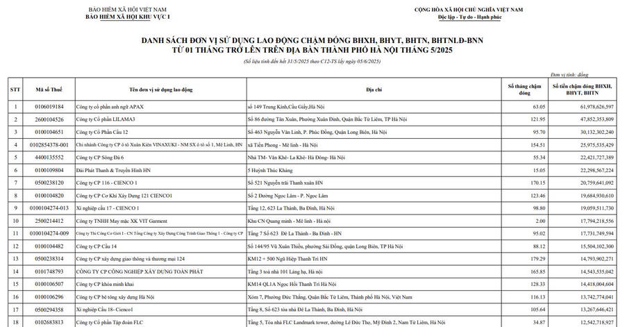 Bảo hiểm xã hội (BHXH) Khu vực I vừa công bố danh sách 33.894 đơn vị chậm đóng bảo hiểm của người lao động từ 1 tháng trở lên, số liệu nợ được tính đến hết ngày 31/5/2025 theo C12-TS lấy ngày 05/6/2025.