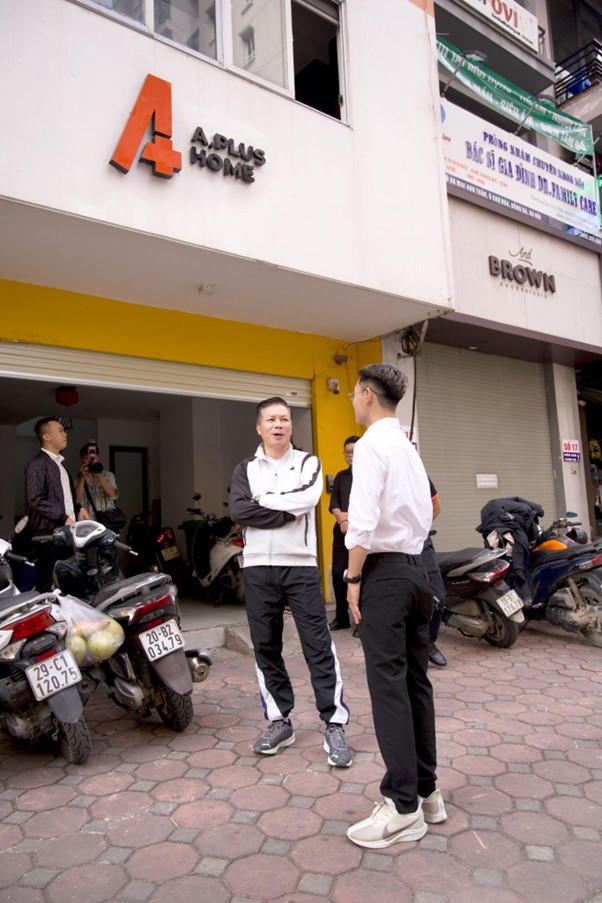 Mới hơn 8 giờ sáng Chủ Nhật, Shark Hưng cùng ê-kip của mình đã có mặt tại Aplus Hoàng Cầu, đón tiếp đoàn có anh Đào Quý Phi - CEO kiêm đồng sáng lập Aplus Home và đội ngũ quản lý khu vực Hà Nội để giúp Shark Hưng hiểu rõ hơn cơ sở vật chất và hoạt động tại điểm kinh doanh đầu tiên trong chuỗi này.