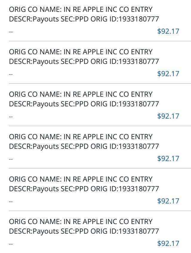 MacRumors là trang đầu tiên cho biết các khoản thanh toán bồi thường đầu tiên trị giá 92.17 USD đã được Apple gửi đến người dùng, đúng theo lộ trình phân bổ trong thỏa thuận. Trên mạng xã hội, người dùng Michael Burkhardt đã chia sẻ ảnh chụp màn hình cho thấy 6 khoản thanh toán trị giá 92.17 USD. Nhiều người dùng iPhone khác cũng chia sẻ rằng họ đã nhận được tiền thanh toán hôm nay.