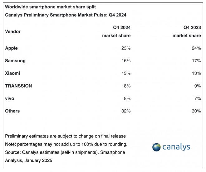 Ước tính có khoảng 330 triệu smartphone được xuất xưởng trong quý 4/2024, tăng 3% so với quý trước và tăng 7% so với cùng kỳ năm ngoái. Tổng số smartphone xuất xưởng trong cả năm 2024 đạt 1,22 tỷ chiếc. Apple dẫn đầu thị trường với 23% thị phần, củng cố vị thế nhờ tăng trưởng mạnh mẽ tại các thị trường mới nổi như Đông Nam Á và Ấn Độ. Samsung đứng thứ hai với 16% thị phần, trong khi Xiaomi vươn lên vị trí thứ ba với 13% thị phần.
