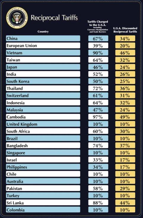 Chính sách thuế đối ứng của Tổng thống Donald Trump thiết lập một mức thuế cơ bản 10% áp dụng cho hầu hết các mặt hàng nhập khẩu từ các đối tác thương mại, sau đó áp dụng thêm các mức thuế "đối ứng" (USA Discounted Reciprocal Tariff) riêng cho từng quốc gia.