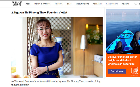Theo Business Insider, bà Nguyễn Thị Phương Thảo là nữ tỷ phú tự thân đầu tiên của Việt Nam với những chiến lược phát triển khác biệt. Đơn vị công bố giới thiệu, bà Thảo đã sáng lập ra hãng hàng không giá rẻ Vietjet vào năm 2011 và từng bước phát triển thương hiệu giúp Vietjet trở thành hãng bay uy tín trong khu vực. Quá trình xây dựng và mở rộng hoạt động của hãng bay đã giúp giá cổ phiếu của Vietjet tăng gấp đôi kể từ thời điểm niêm yết vào năm 2017 trên sàn giao dịch TP HCM.
