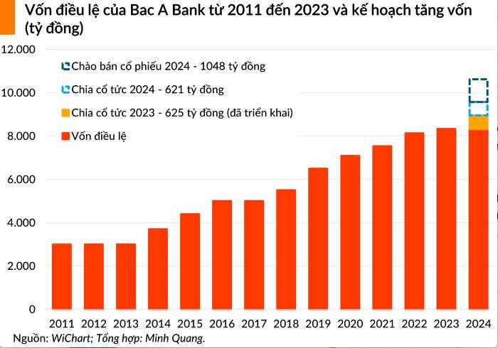 Dự kiến, nếu tiếp tục thực hiện hai phương án đã được ĐHĐCĐ năm nay thông qua, vốn điều lệ của Bac A Bank sẽ được tăng thêm 1.668 tỷ đồng, lên mức 10.627 tỷ đồng. Theo kế hoạch ban đầu, nếu vẫn giữ phương án chào bán năm 2023 (89,6 triệu cổ phiếu), vốn điều lệ của Bac A Bank có thể tăng lên 11.524 tỷ đồng.
